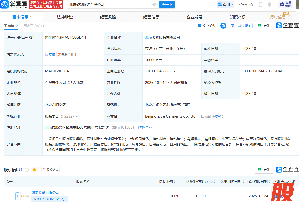 近日,北京姿彩服装有限公司成立,法定代表人为侯立成,注册资本为1亿元,经营范围包含:服装服饰零售;服装制造;专业设计服务;针纺织品销售;箱包制造;箱包销售;鞋帽批发等。企查查股权穿透显示,该公司由朗姿股份(002612)全资持股。