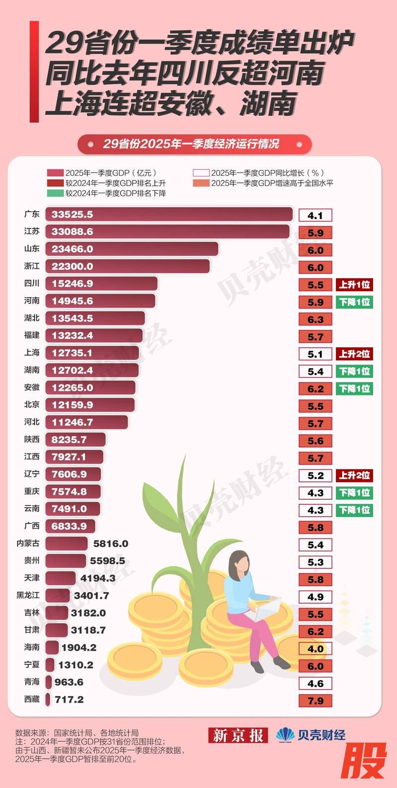 与2024年末相比,各省份经济位次暂未发生变化,广东、江苏、山东稳居前三,地区生产总值分别为3.35万亿元、3.31万亿元、2.35万亿元。与去年一季度相比,经济总量排行前十的省份中,四川超越河南升至第五位,上海连超安徽、湖南;经济总量排行前二十的省份中,辽宁连超重庆、云南,升至第十六位。